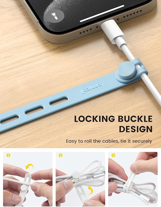 - Organization & Portable : These cord organizer cable ties are designed with easy and secure installation in mind, allowing you to quickly organize your cables without any hassle. Just put your cables into the button position, lock and roll it. Say goodbye to the tangled headphones or messy cables in your bag. Save your storage space while on-the-go