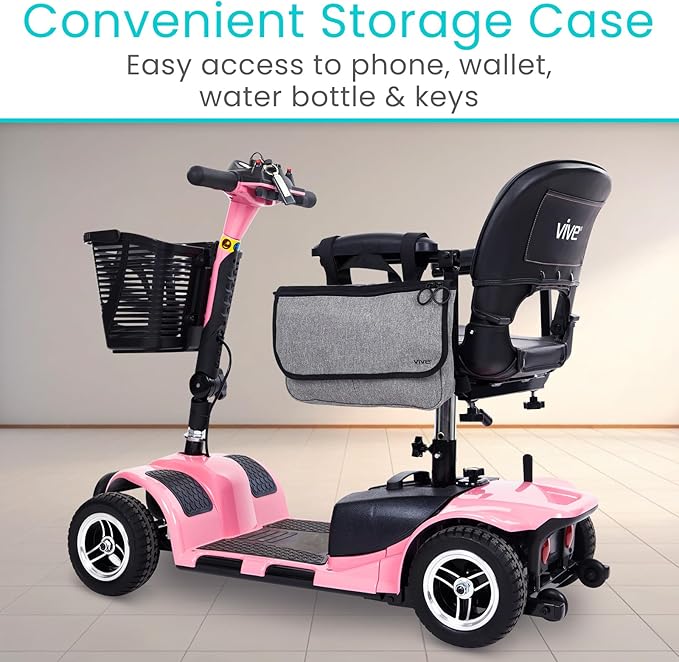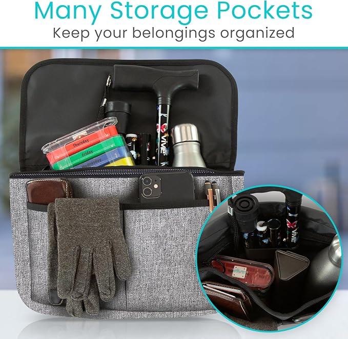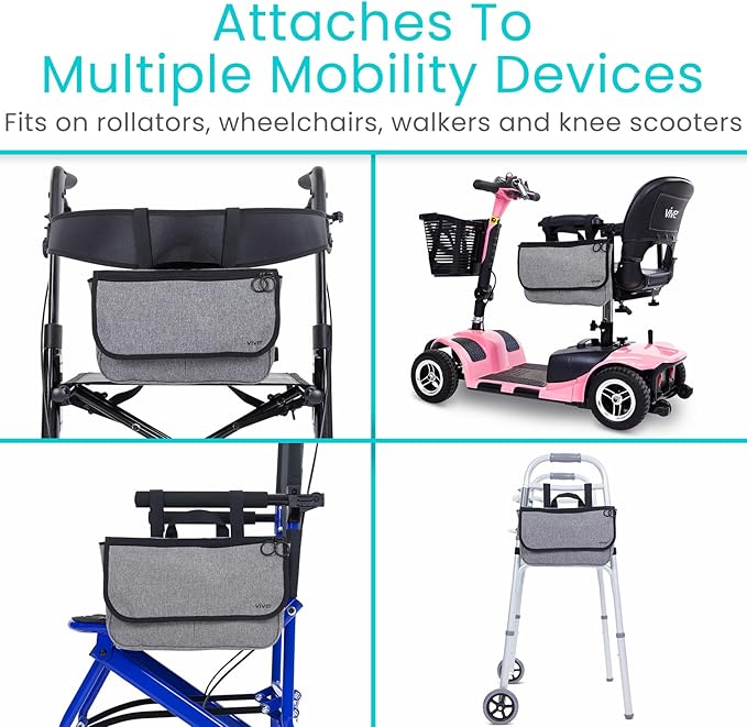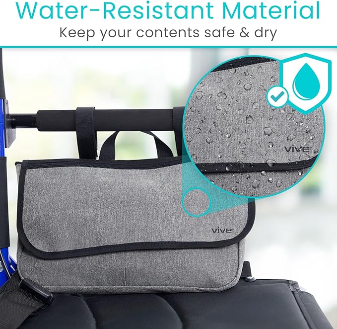 - STAY ORGANIZED ON THE GO: Keep your essentials close and organized with the Vive mobility side bag, designed to securely attach to any wheelchair, scooter or rollator. With multiple compartments, you can store drinks, snacks, glasses, electronics, and medications with ease.
