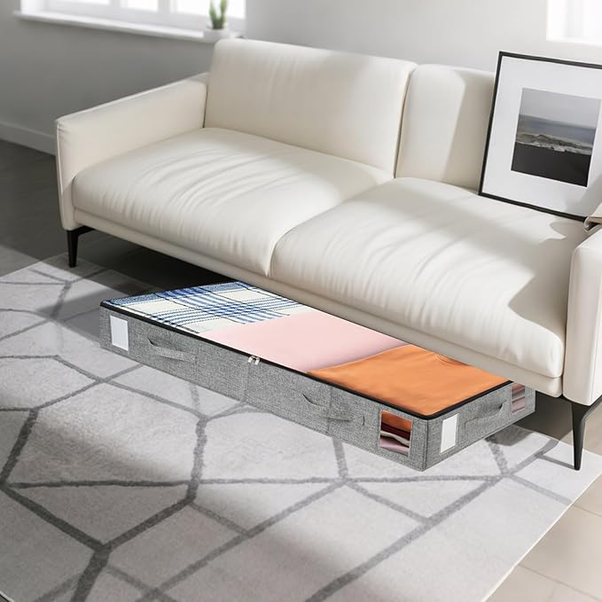 - Large Capacity: Each Low Profile under bed storage container has a large 45-liter capacity, it can hold a king-size comforter or 15-30 items of clothing, including sweaters, jeans and jackets. Measures 33”L x 16.5”W x 4.5”H, fits for narrow underbed spaces. When not in use can fold up it for space-saving storage