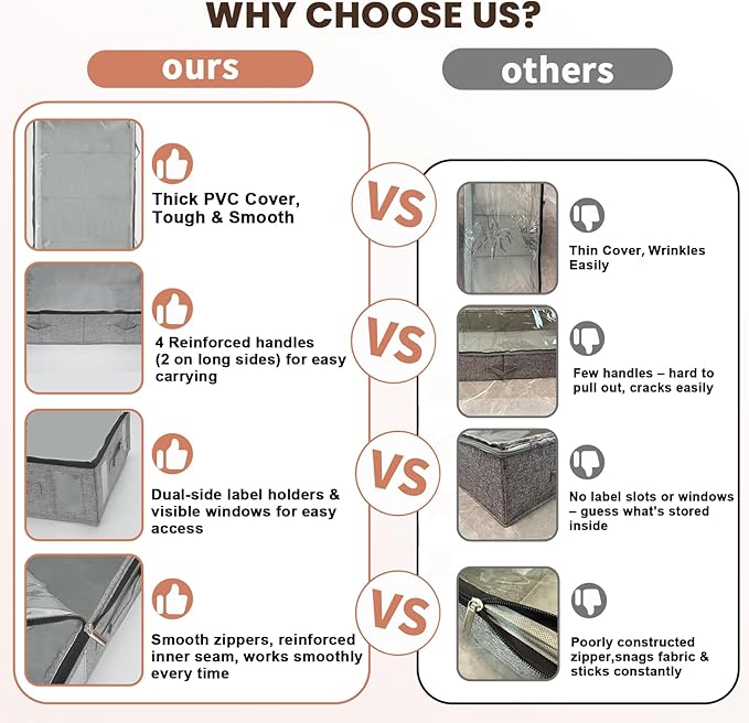 - Easy Access&View: Large clear top window allows you to to see what’s inside easily; the label holders with blank cards on two sides for your mark, two visible windows help you identify the contents more quickly. 4 reinforced handles make it easy to carry and pull out the bin from any direction under the bed with ease. Double strong metal zippers making for smooth and easy open and close, protecting your items from dust and moisture for long-term storage