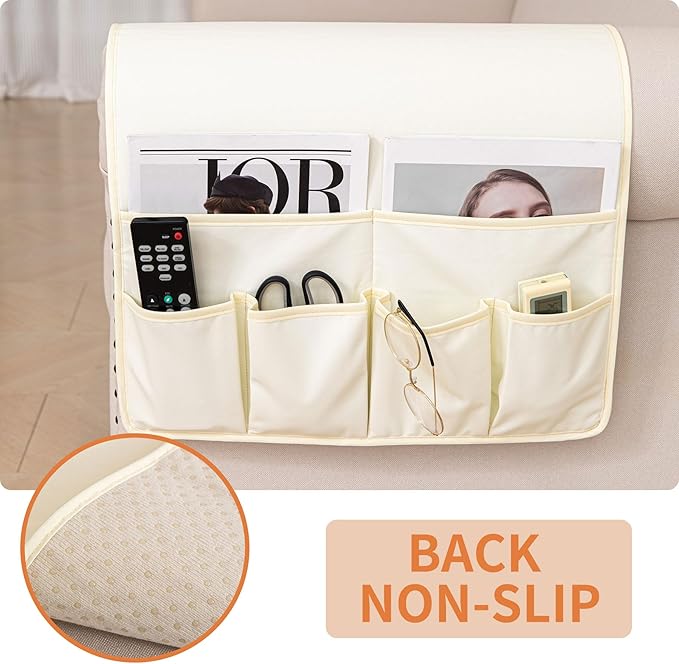 HAOMAIJIA Anti Slip Sofa Armrest Organizer Arm Chair Bedside Caddy Storage Organizer For Recliner Couch With 6 Pockets For Cell Phone Tv Remote Control (Ivory White, 31.89 inches × 18.5 inches)
