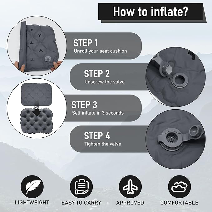 - Self-Inflating Cushion For Multi-Scenario Use: Suitable for travel, camping, sporting events, boating and many other scenarios, can be used with folding chairs, outdoor chairs or kayak seats, self-inflating design makes it more convenient to use.