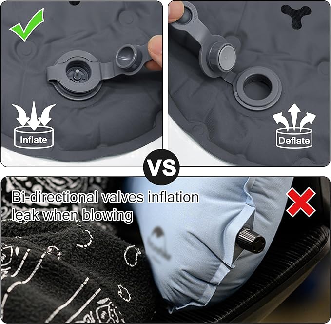 - Specially Designed Portable Cushions: Our cushions are designed with special materials: 40D nylon on the front and 73D nylon on the back, so the material on the back of the cushion is stronger and more tear-resistant, so the shape of the cushion will be a little twisted after inflation, but this does not affect the effect of the use of the cushion, but rather it is a strong evidence that the cushion is better quality.