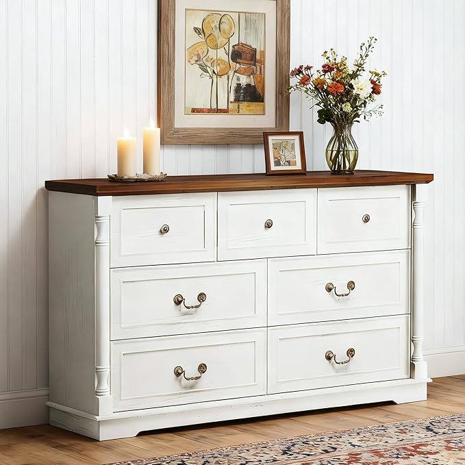 Fkhouse 52" Farmhouse 7 Drawer Dresser for Bedroom,Tall Wide Wood Country Rustic Chest of Drawers,Column Decor,Retro Handle,Natural Texture,Wood Vintage TV Stand,Antique White