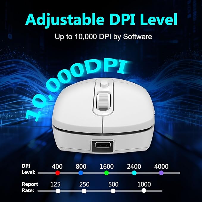- 【High-Precision Gaming Mouse】 The wireless mouse features 5 adjustable DPI (400-800-1600-2400-4000), up to 10,000 DPI by software and 4 adjustable polling rates ( 125Hz/250Hz/500Hz/1000Hz), you can easily adjust the moving speed, and experience a smooth, fast response and accurate tracking gaming experience.