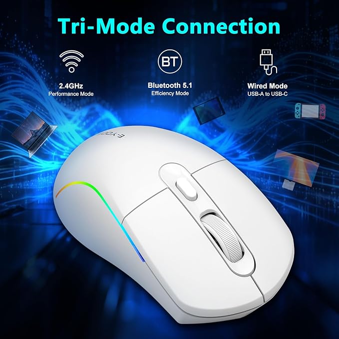 - 【Tri-Mode Connection & Universal Compatibility】 This wireless mouse game not only supports 2.4Ghz wireless connection and Type-c wired connection, but also supports Bluetooth 5.1 connection, which can be easily switched between different devices or systems to achieve one-to-many use. This wireless optical mouse is compatible with Windows 11, 10, 8.1, 8, 7, XP, Vista, Linux, Chromebook, Mac OS, Surface Pro, Surface, and Any Device with USB Ports. As well as compatible for PC, Laptop, MacBook and more.