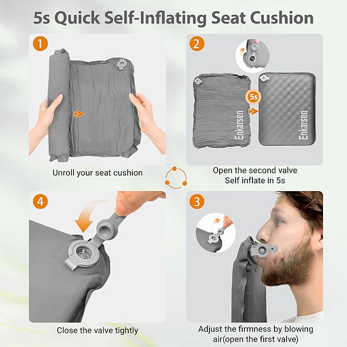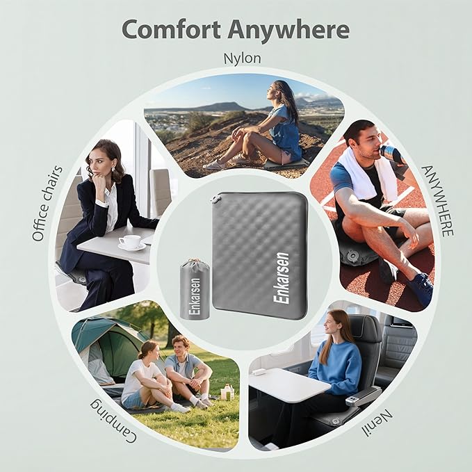 - 5-SECOND SELF-INFLATING COMFORT – NO PUMP NEEDED:The Enkarsen inflatable seat cushion is a true self inflating seat cushion designed for convenience. Just open the second air valve, wait about 5 seconds, and you’ll have a fully formed blow up seat cushion for travel. For the very first inflation, it may take a bit longer, and you can fine-tune the thickness and firmness by blowing in a little extra air. When it’s time to pack away, simply open the valve, roll it up, and ready for your next trip.
