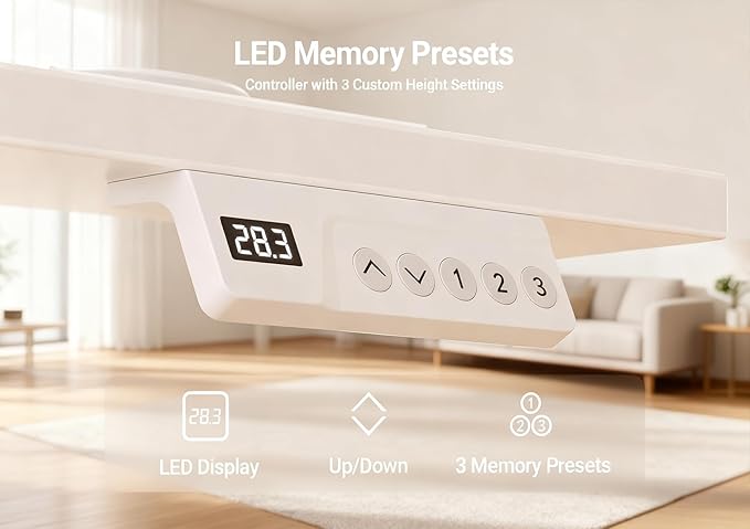 - Personalized Sit-Stand Comfort: With 3 programmable memory presets and a clear LED controller, switching between your preferred sitting and standing heights is instant. One-touch standing helps reduce long-hours sitting fatigue.