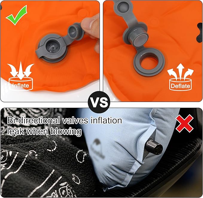 - Specially Designed Portable Cushions: Our cushions are designed with special materials: 40D nylon on the front and 71D nylon on the back, so the material on the back of the cushion is stronger and more tear-resistant, so the shape of the cushion will be a little twisted after inflation, but this does not affect the effect of the use of the cushion, but rather it is a strong evidence that the cushion is better quality.