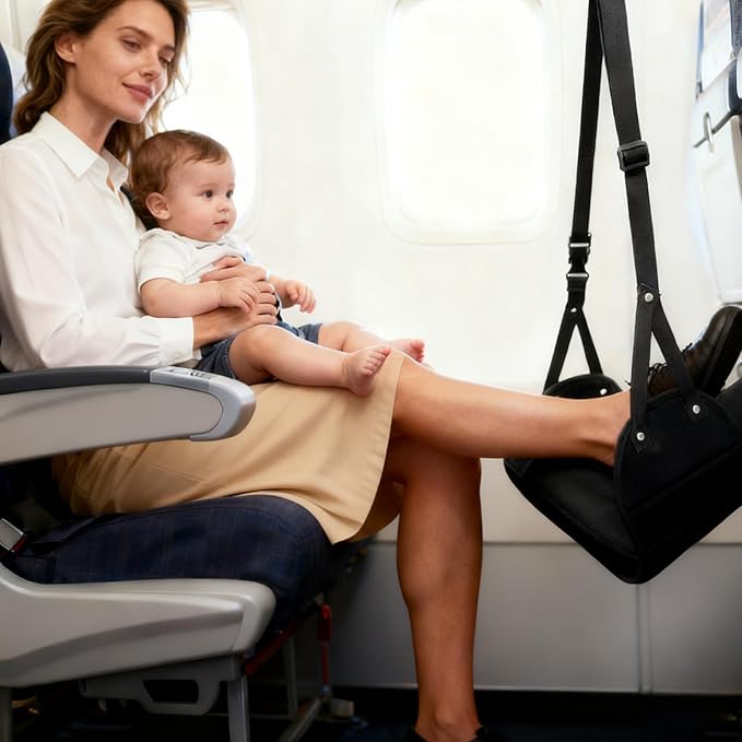 - Subtle Aesthetic This foot sling for airplane travel features an all-black low-profile design making it ideal quiet environments such as flights where maintaining discretion is key to enhancing relaxation without unnecessary distractions