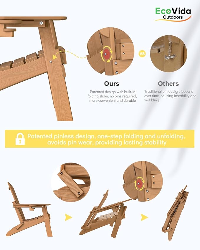 - 【Easy to Fold – No-Pin Folding Structure】 This easy-to-fold Adirondack folding chair adopts a pin-free folding structure, allowing smooth and fast folding and unfolding. Built-in stress blocks eliminate problems caused by long-term pin wear, such as loose joints or unsmooth operation. The result is a durable, space-saving chair that is safer and more convenient, and easy to store.