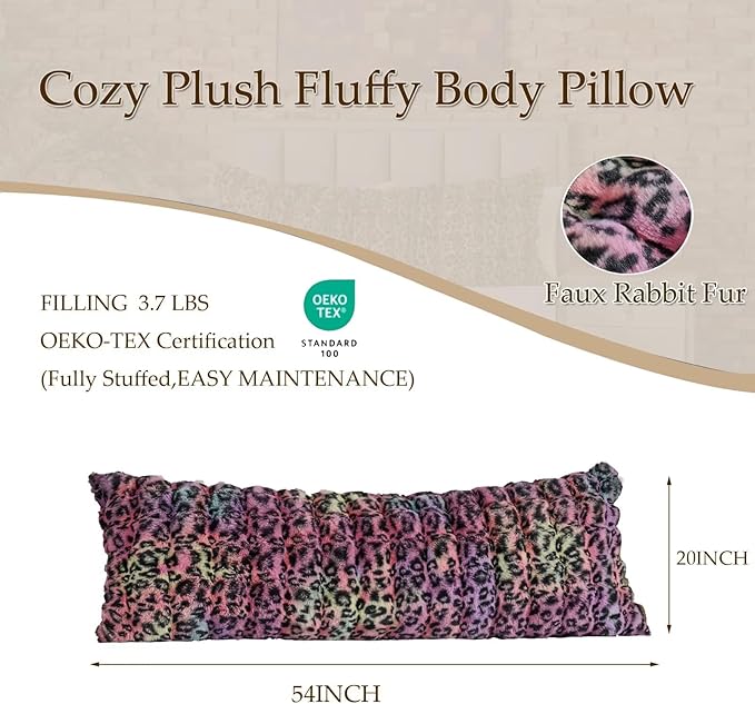 20x54 Fluffy Leopard Print Full Body Pillow,Cheetah Print Plush Fuzzy Faux Fur Body Pillows,Ultra Soft Bed and Sofa Pillow for Side Sleeper & Pregnancy,Furry Long Pillows-Rainbow Leopard