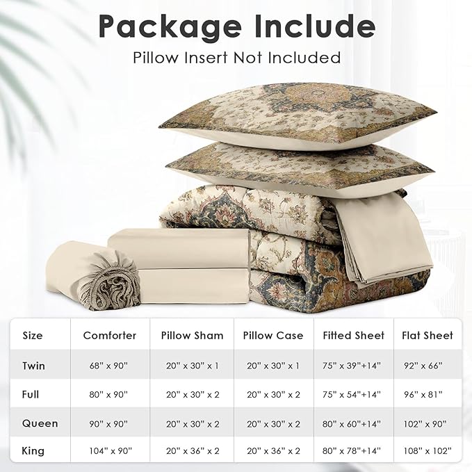 - Twin Size Set: Includes one comforter (68" x 90"), one pillowcases (20" x 30"), one pillow shams (20" x 30"), one fitted sheet (39" x 75" + 14"), and one flat sheet (92" x 66"). Pillow inserts not included.