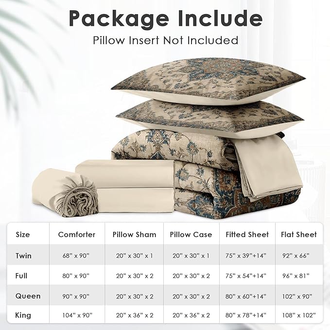 - King Size Set: Includes one comforter (90" x 104"), two pillowcases (20" x 36"), two pillow shams (20" x 36"), one fitted sheet (78" x 80" + 14"), and one flat sheet (108" x 102"). Pillow inserts not included.