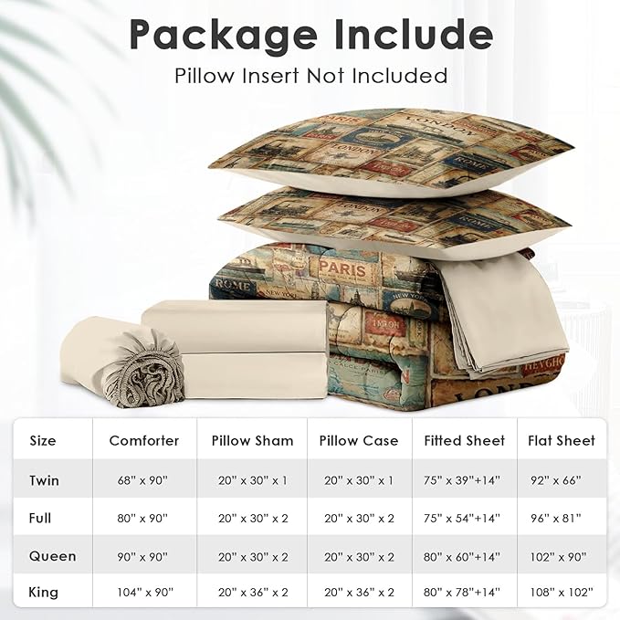- King Size Set: Includes one comforter (90" x 104"), two pillowcases (20" x 36"), two pillow shams (20" x 36"), one fitted sheet (78" x 80" + 14"), and one flat sheet (108" x 102"). Pillow inserts not included.