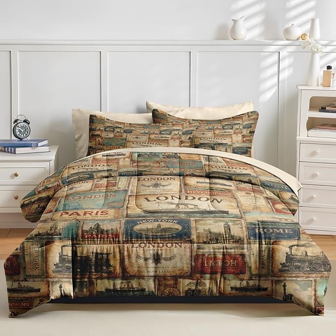 Comforter Set King Size, Vintage Travel Nautical 7 Pcs Bedding for Kids and Adults, Retro Antique Bed Sheet Sets with Fitted Sheet 2 Pillowcases & 2 Shams for Bedroom Bed Decor